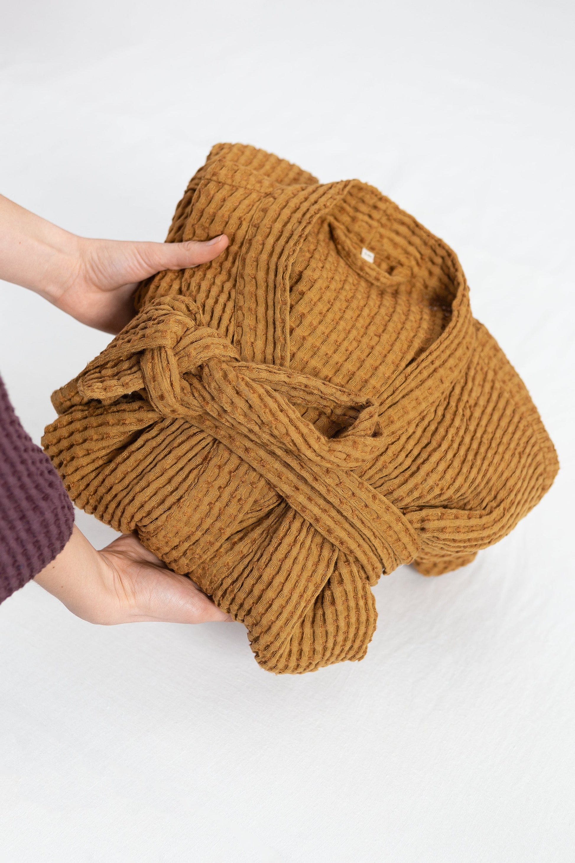 A perfect gift for you and your beloved one! Waffle linen robe is made from high-quality European linen (54%) and cotton (46%) blends. Their soft and luxurious, puffy waffle structure will make your skin smooth and gentle with its perfect massage effect, as well as will give you an authentic look. Linen fabric is highly absorbent and dries quickly, which makes it perfect for bath wear. It will look better and better with age and every wash.